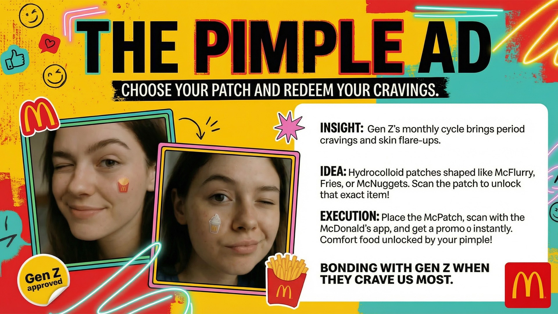 Tackling Gen Z's monthly cravings and flare-ups. Comfort food meets self-care with a playful McDonald's twist.